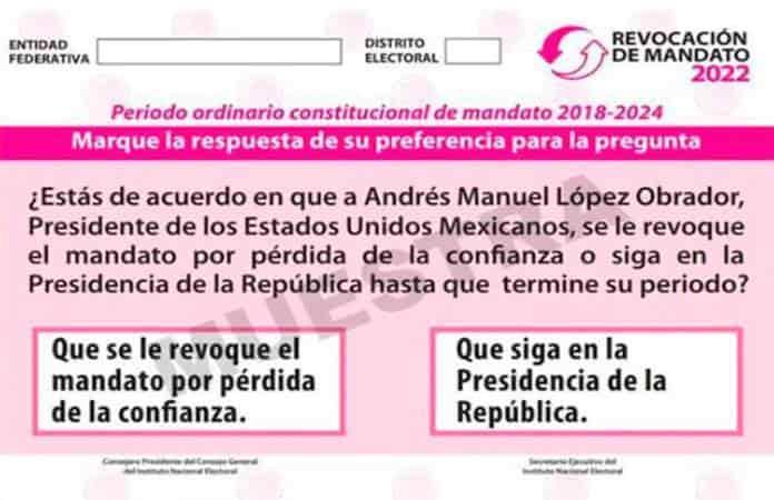 En la boleta se imprimirá la pregunta: "¿Estás de acuerdo en que a Andrés Manuel López Obrador, Presidente de los Estados Unidos Mexicanos, se le revoque el mandato por pérdida de la confianza o siga en la Presidencia de la República hasta que termine su periodo?".