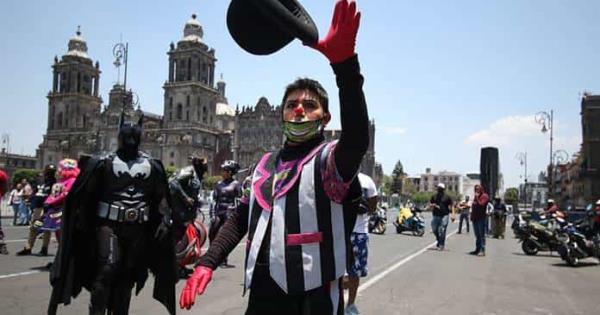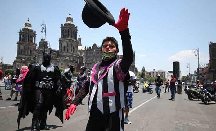 CIUDAD DE MÉXICO.- En el Día del Niño, alrededor de 100 payasos, botargueros y músicos que regularmente se encuentran en la calle Madero, se manifiestan frente a Palacio Nacional para solicitar ser incluidos en el programa de apoyos que el gobierno federal ha entregado para poder enfrentar el impacto económico ocasionado por la pandemia del Covid-19.