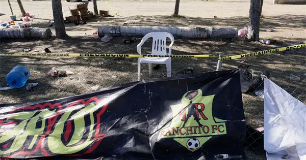 SALAMANCA, México (AP) — Envases de cerveza, ropa con aparentes restos de sangre y algunas veladoras permanecían el lunes esparcidos por un campo de fútbol local del municipio de Salamanca, una localidad del estado de Guanajuato, en el centro de México, donde el domingo murieron al menos 11 personas y otras 12 resultaron heridas cuando individuos armados dispararon contra la gente que pasaba la tarde después de un partido.