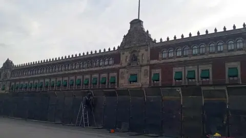 El cerco metálico cubre toda la fachada principal del recinto presidencial, en el Zócalo capitalino, y forma parte de las medidas preventivas adoptadas por el Gobierno federal para resguardar las instalaciones durante la movilización, que ha sido difundida ampliamente en redes sociales.