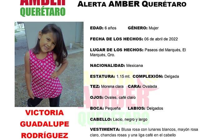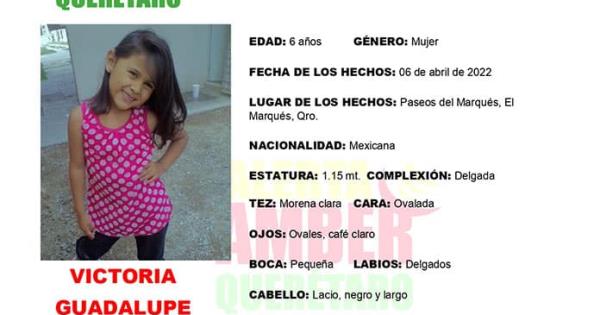 CIUDAD DE MÉXICO, abril 7 (EL UNIVERSAL).- La Fiscalía de Querétaro activó la Alerta Amber para la localización de Victoria Guadalupe Rodríguez Martínez, una menor de seis años que fue vista por última vez la tarde de este miércoles.