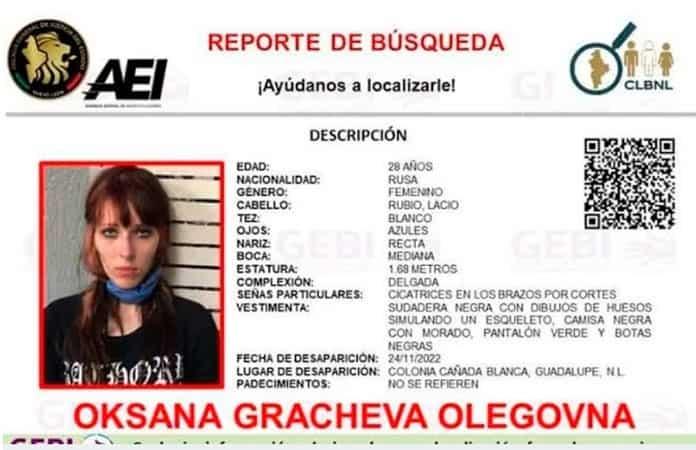 CIUDAD DE MÉXICO, noviembre 29 (EL UNIVERSAL).- El Grupo Especializado en Búsqueda Inmediata (GEBI), perteneciente a la Fiscalía General de Justicia de Nuevo León (FGJNL), publicó una ficha de búsqueda de Oksana Gracheva Olegovna.