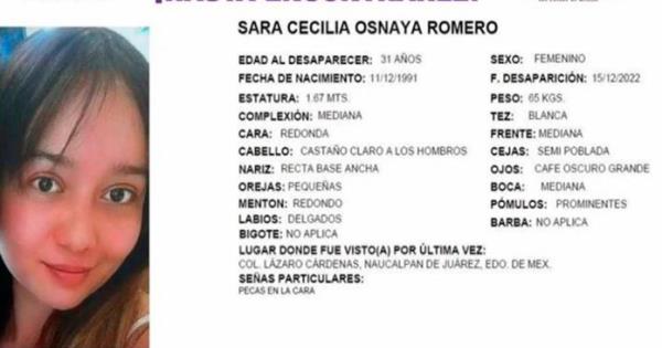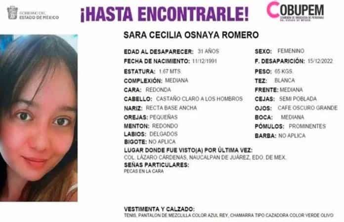 NAUCALPAN, Méx., diciembre 19 (EL UNIVERSAL).- Sara Cecilia Osnaya Romero de 31 años, desapareció el 15 de diciembre cerca de la avenida San Esteban, en las inmediaciones del campo Militar número 1, por lo que su familia reportó su desaparición ante autoridades de la Fiscalía General de Justicia del Estado de México.