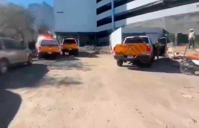 A través de la plataforma X, antes Twitter, Protección Civil Monterrey dijo que el elevador de carga se ladeó mientras iban cinco personas en su interior, además de sacos de arena.