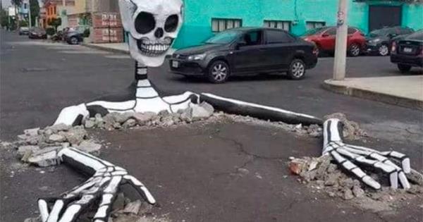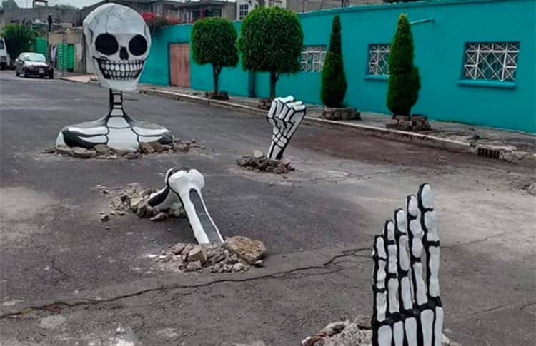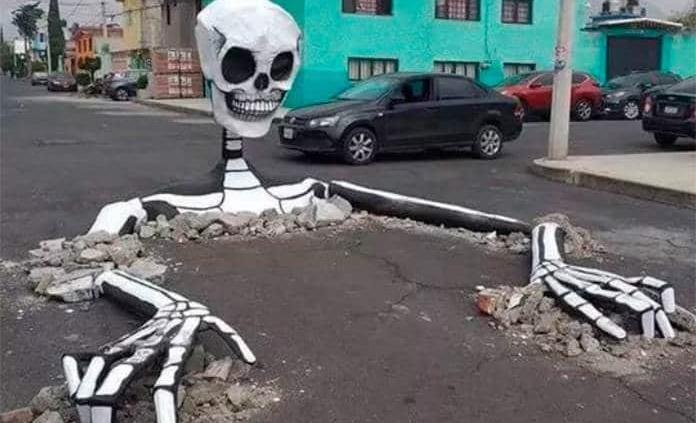 En redes sociales circula la versión de que vecinos de la alcaldía Tláhuac aprovecharon los baches que hay en la demarcación para colocar calaveras gigantes por el Día de Muertos.