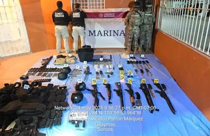 Tras recibir una denuncia ciudadana, los uniformados aseguraron en flagrancia a los sujetos en la colonia Guaymas Norte y se incautaron siete armas largas, tres cortas, 56 cargadores y mil 90 cartuchos útiles de distintos calibres.