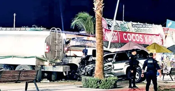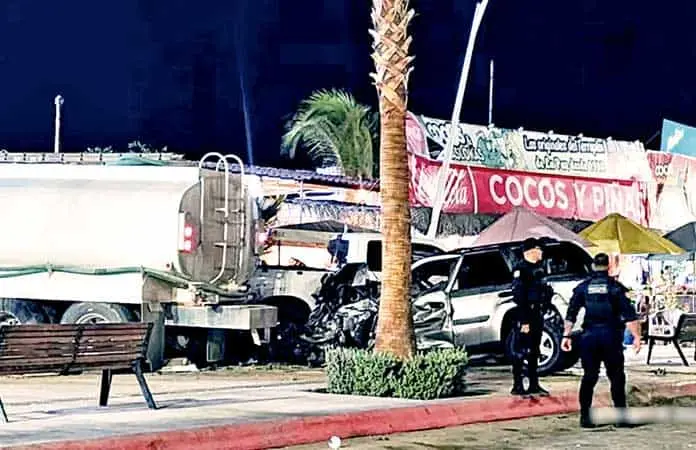 La Paz, BCS.- Un pipa chocó contra varios automóviles en una zona del malecón de La Paz, Baja California Sur, en un parque y puesto de cocos y aguas frescas y dejó al menos tres personas gravemente heridas.