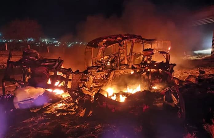 Durango, Dgo.- Un camión de pasajeros chocó con un tractocamión a la altura de la comunidad de Velardeña, Durango, lo que provocó la muerte por calcinación de 14 pasajeros.