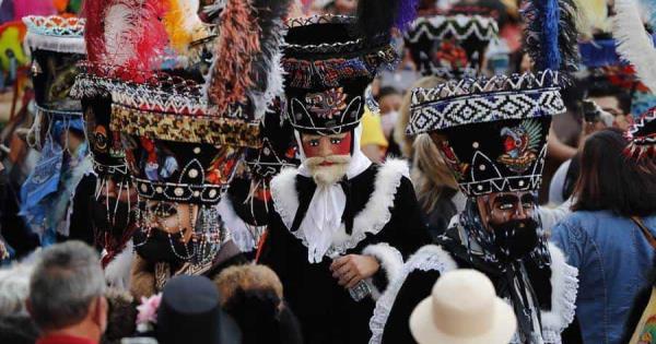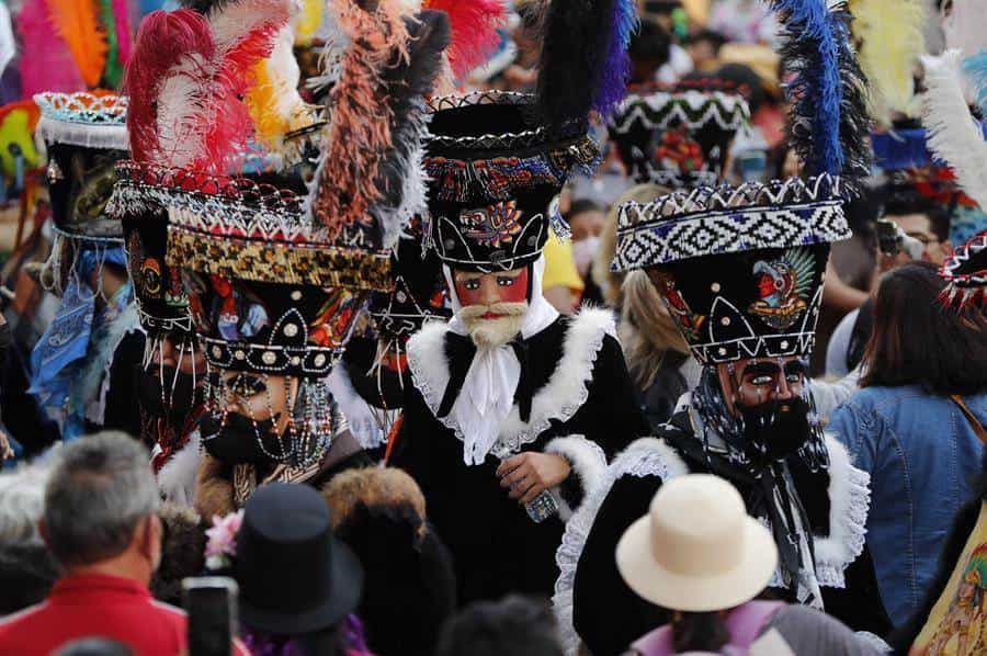 Los participantes del desfile iban disfrazados con largas túnicas de terciopelo, grandes sombreros de palma, guantes y máscaras con barba que emulan a los gobernantes españoles durante la colonia de la Nueva España, actual México.