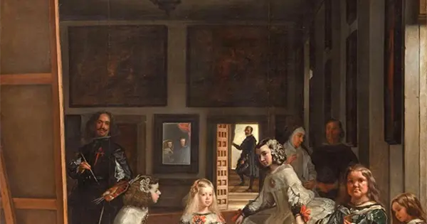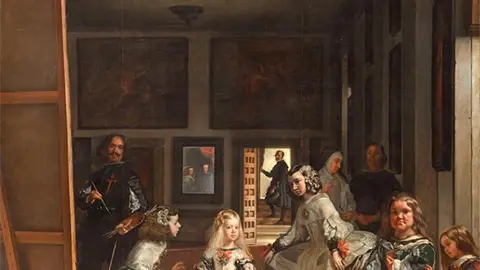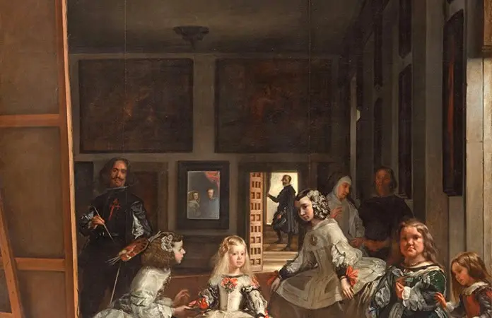 ? Las meninas de Diego de Velázquez, Museo del Prado, Madrid. Al centro aparece la infanta o princesa, atendida por sus muy jóvenes y solicitas nanas o meninas. Todos parecen mirar al espectador incluso el autor, pincel en mano.