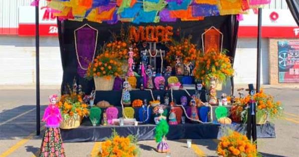 Una fila de veladoras y ramos de flores de cempasúchil conducen el camino al altar que se diseñó en memoria al hijo del "Chapo Guzmán", con tres niveles, donde se colocaron flores, adornos, figuras de catrinas, veladoras con imágenes de calaveritas y diversas bebidas.
