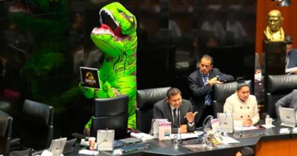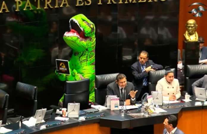 Xóchitl Gálvez, senadora del Partido Acción Nacional (PAN), se enfundó en la botarga de dinosaurio, por lo cual no pudo ser sacada del recinto como lo solicitó el presidente de la Mesa Directiva, Alejandro Armenta.