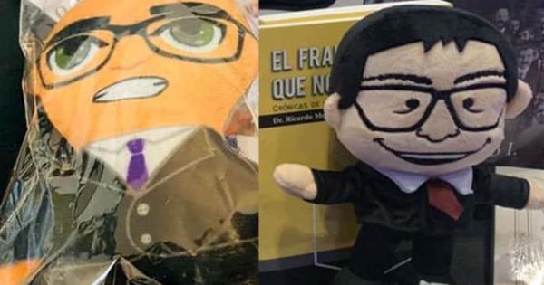 El peluche del canciller Marcelo Ebrard conserva los característicos lentes negros en los que destacan sus ojos, vestido con un traje negro, camisa blanca y una corbata guinda.