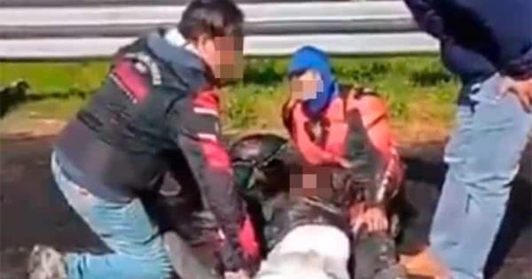 "¡Dana no te duermas! ¡Dana!", exclama un motociclista junto al cuerpo de una mujer, quien al parecer lo acompañaba cuando chocaron en la autopista México-Cuernavaca, a la altura de Tres Marías tras pasar la curva de La Pera.