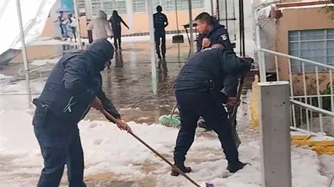 Personal de Protección Civil evacuó alumnos y docentes de la primaria afectada, retiró el granizo acumulado y aseguró las zonas.