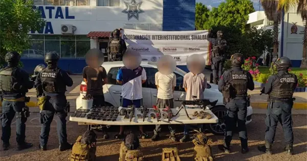 CULIACÁN, Sin.- En el fraccionamiento Valle Alto, en la parte nor-poniente de la capital del estado, el grupo de las Fuerzas Especiales del Estado detuvo a cuatro personas del sexo masculino, entre ellos un menor de edad, a los que les aseguraron cinco armas automáticas, chalecos tácticos con placas balísticas y cargadores.