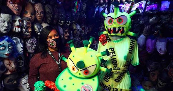 En un recorrido que realizó EL UNIVERSAL se observó que con 250 pesos se puede obtener el novedoso disfraz del Covid-19, un traje completo, de color verde fosforescente, y que va rematado con una especie de máscara o casco con picos, además de una tira amarilla de plástico en todo el cuerpo con la leyenda ¡Peligro!