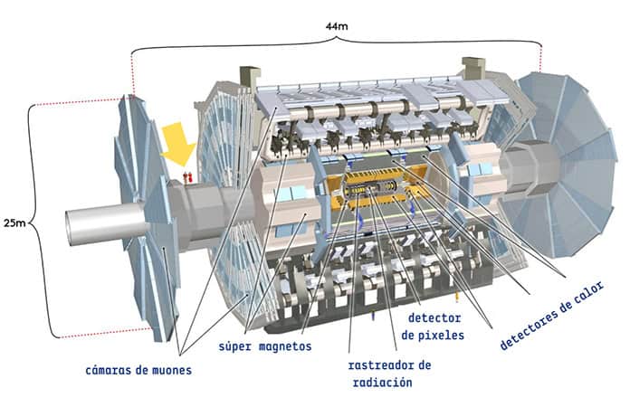 ? La enorme cámara Atlas (observe el tamaño de las dos personas en el eje izquierdo, Flecha), canaliza los protones que viajan en ambas tuberías a ductos muy delgados (diámetro de un cabello).