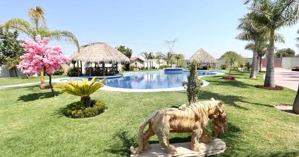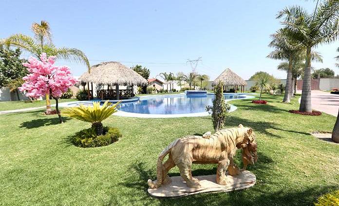 La alberca está llena y limpia, los andadores con losa que semeja adoquín de la zona de jardines lucen impecables, tres palapas en diversas dimensiones están dispersas, cerca de la alberca y en torno al asador.