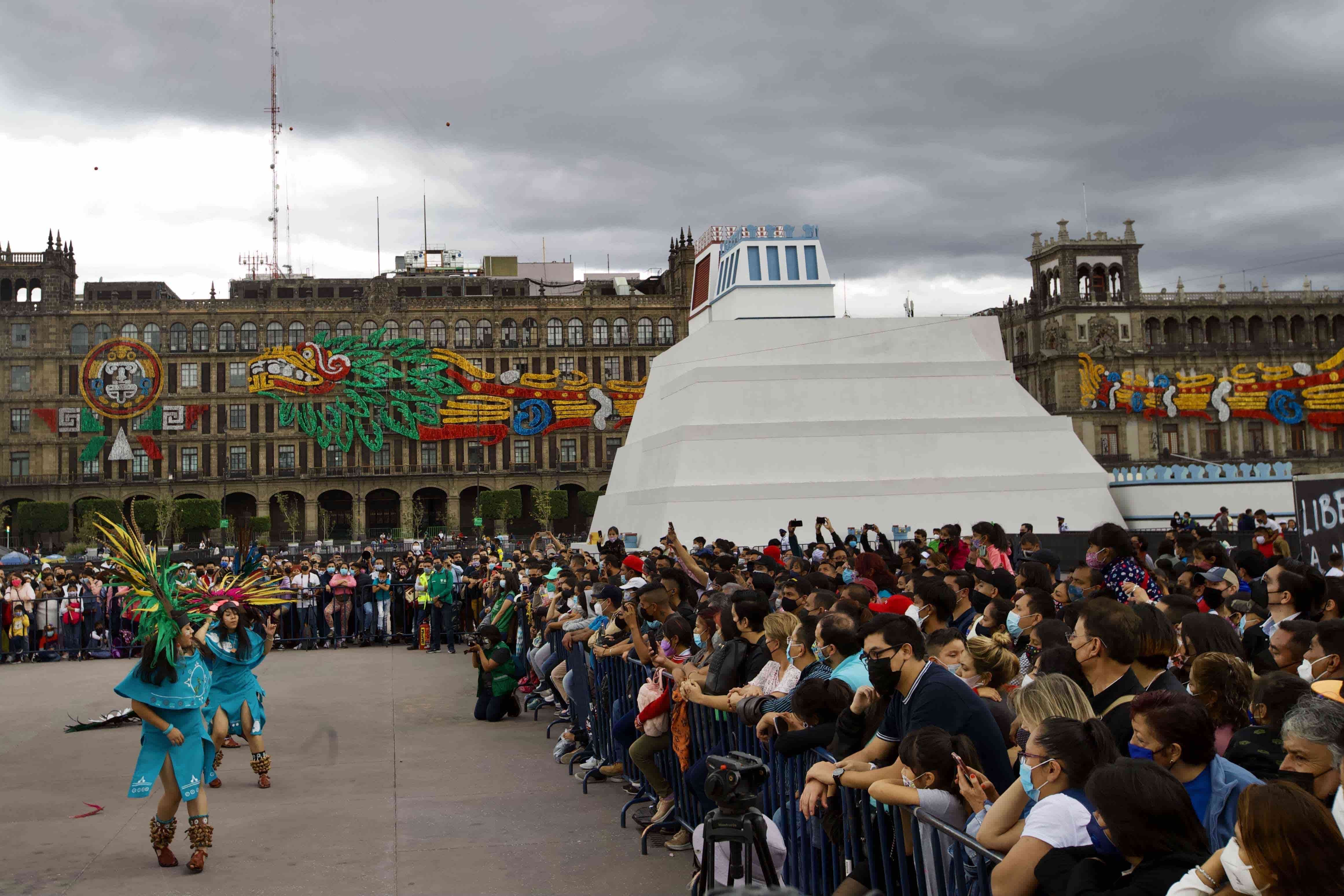 El juego de pelota tuvo lugar al lado de una réplica monumental del antiguo Templo Mayor de los mexicas levantada hace dos semanas por el Ayuntamiento.