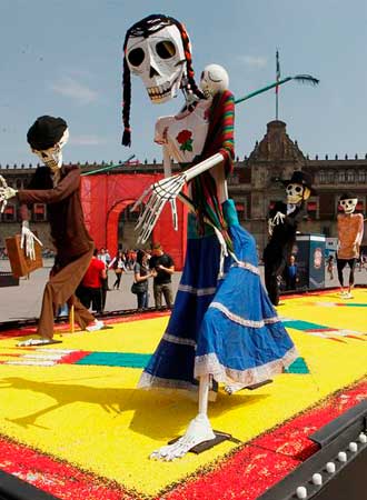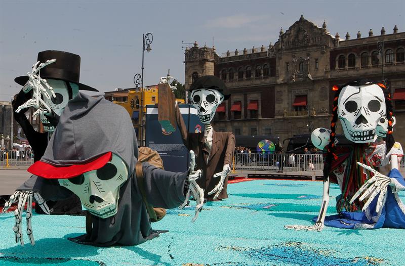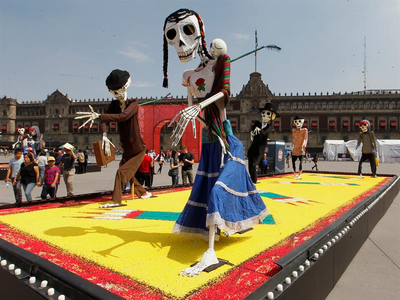 Cinco catrinas decoran las plataformas ubicadas en el Zócalo y homenajean a los migrantes con motivo de la festividad mexicana más universal, celebrada cada 1 y 2 de noviembre.