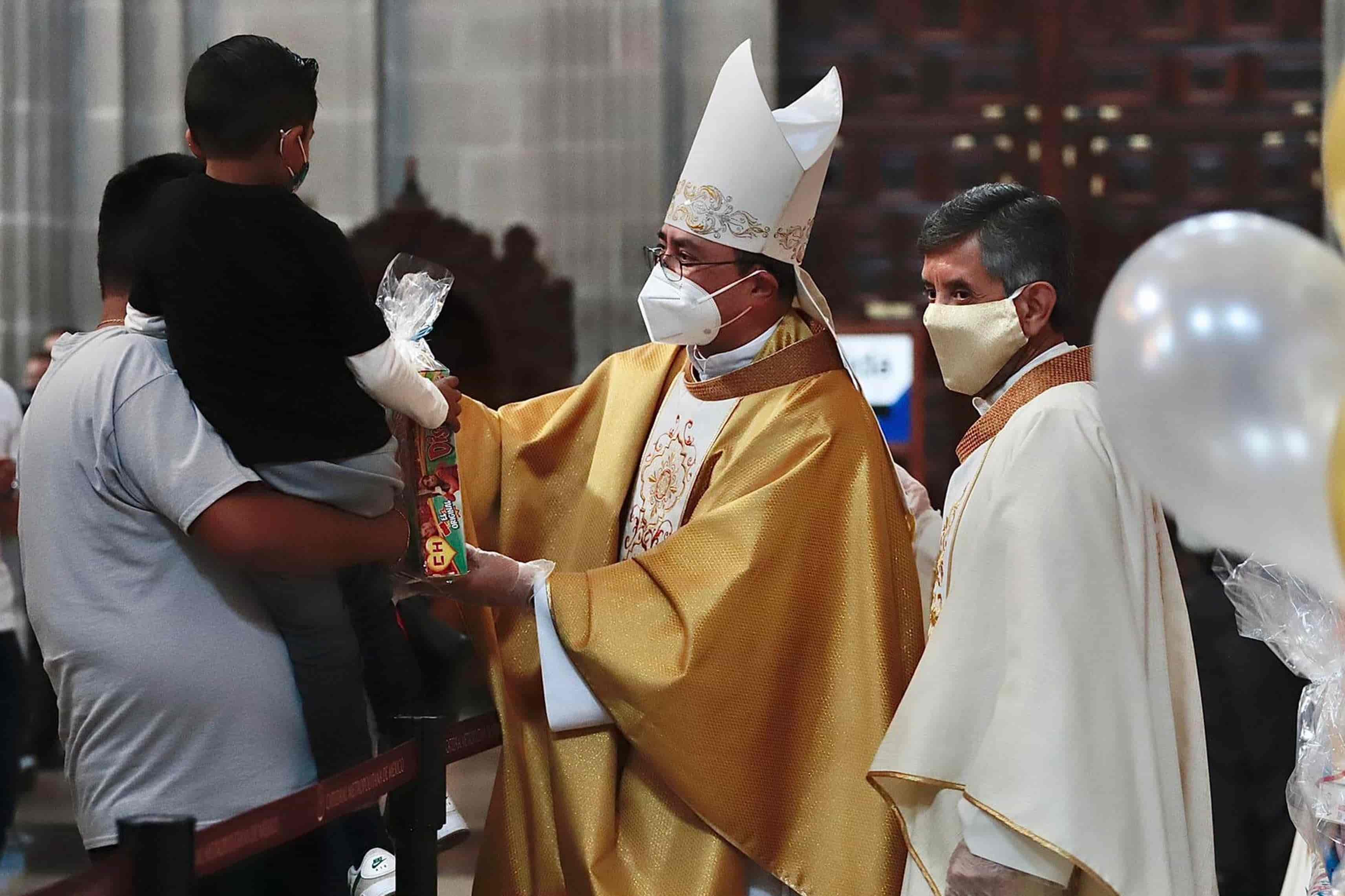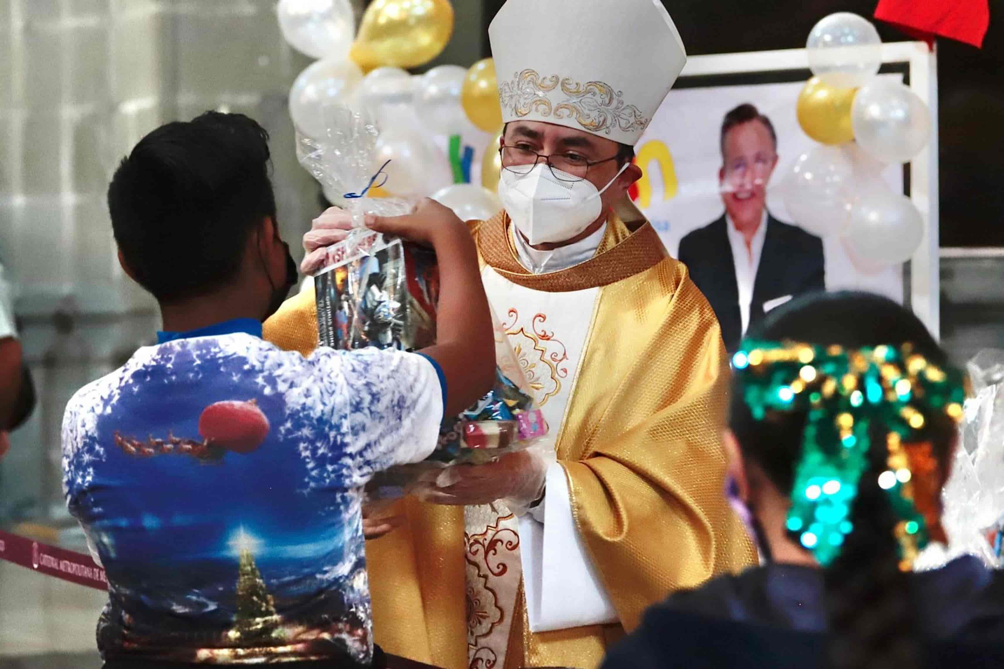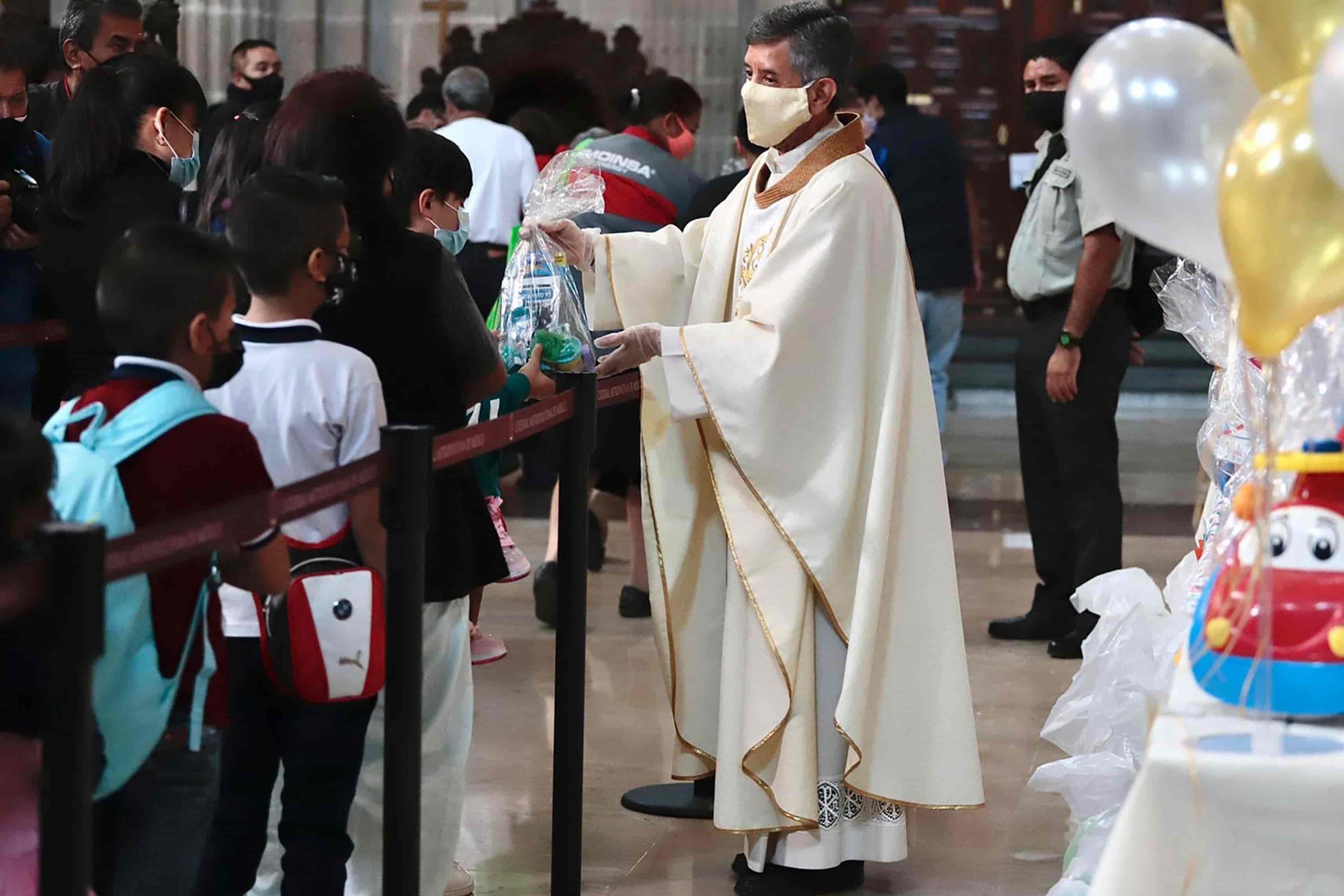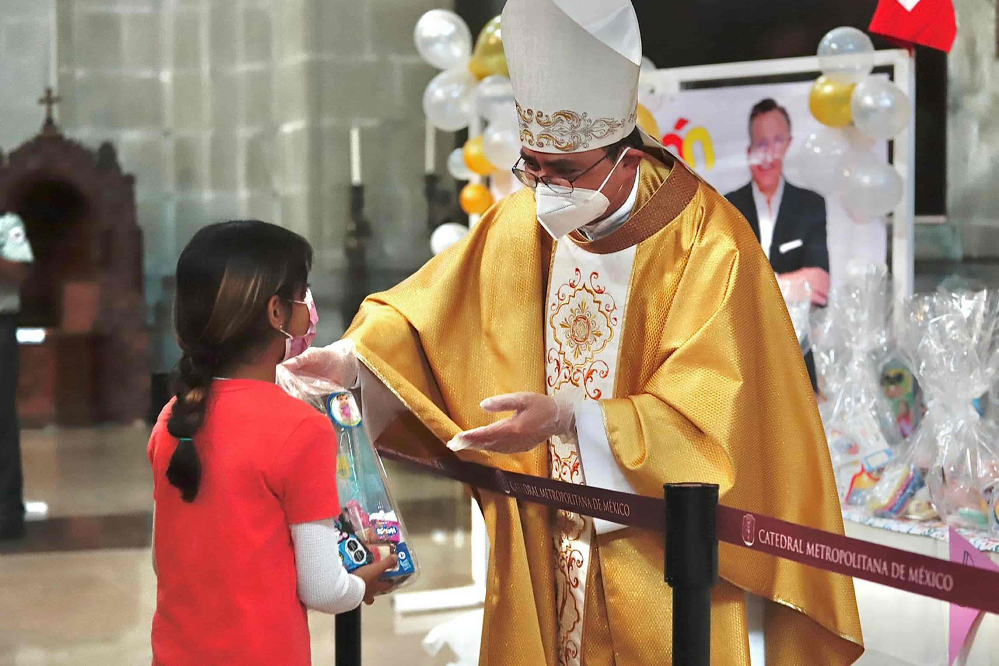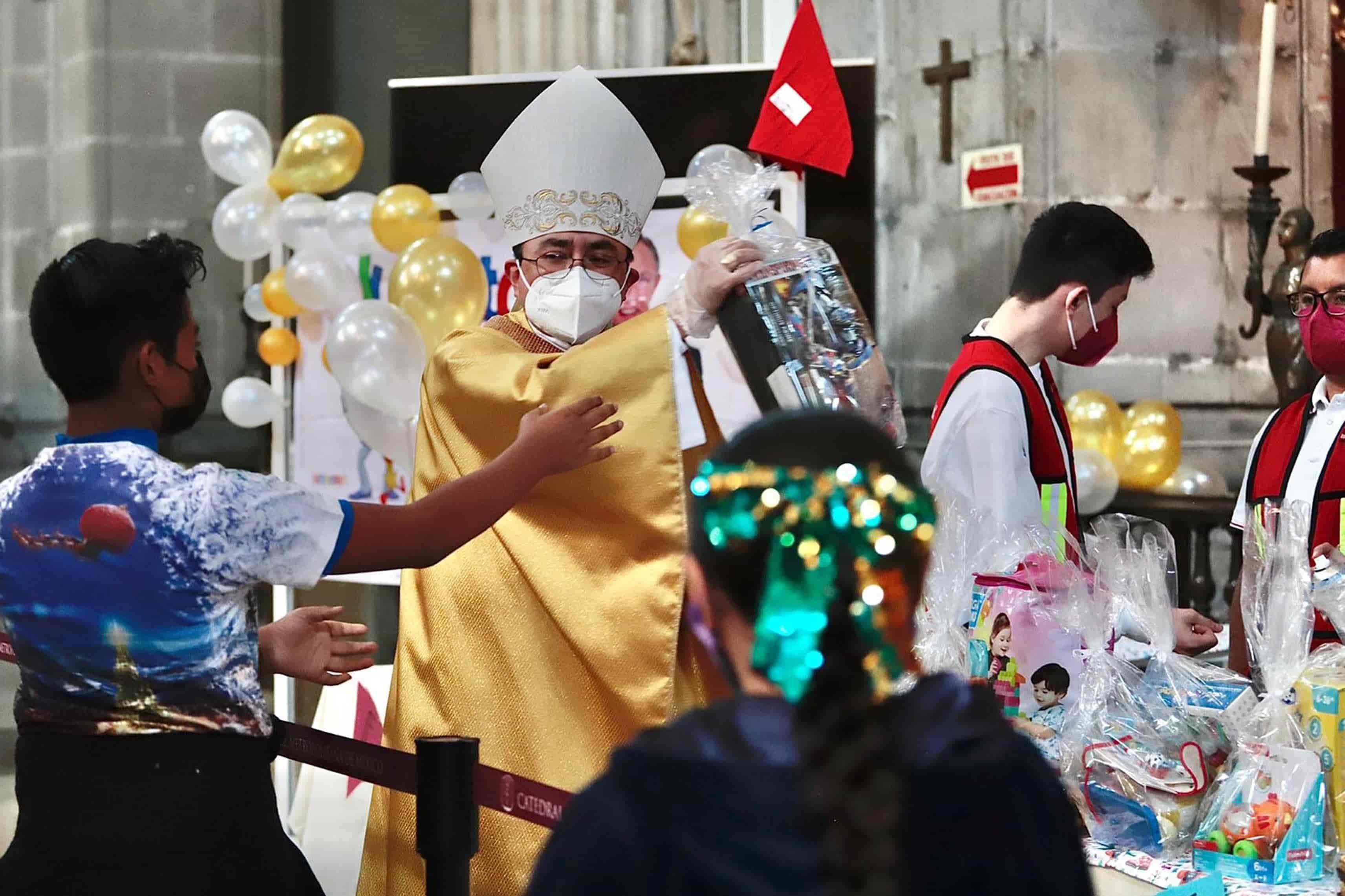 CIUDAD DE MÉXICO, enero 9 (EL UNIVERSAL).- Fue al final de la homilía dominical, presidida por el Obispo auxiliar de la Arquidiócesis Primada de México, Salvador González Morales y el de Deán de la catedral Metropolitana, Ricardo Valenzuela, cuando los obispos entregaron juguetes a los niños presentes en la celebración religiosa.