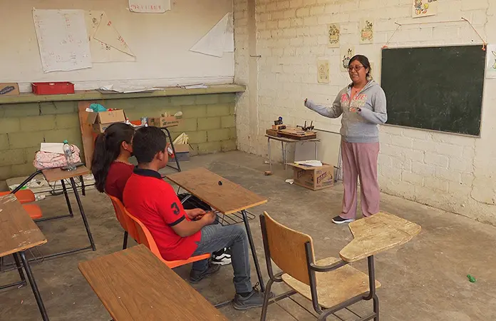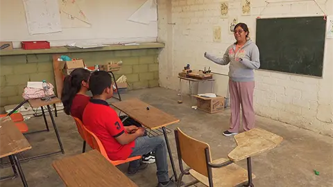 Esmeralda emprendió la tarea de revivir el ixcateco entre los niños y adolescentes de Santa María Ixcatlán, y muestra cómo en un salón en desuso enseña a un grupo de diez menores las primera palabras que, de acuerdo con su plan de estudios elaborado por ella misma, deben conocer para comenzar una conversación y nombrar los alimentos, animales u objetos con las que conviven.