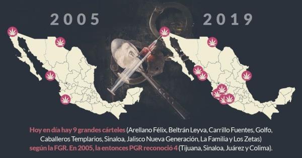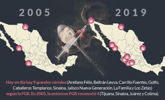 Esta cantidad de grandes organizaciones criminales es dos veces mayor a la que la Procuraduría General de la República –hoy Fiscalía General de la República (FGR)– reconoció en 2005, cuando los principales cárteles eran los de Tijuana, Sinaloa, Juárez y Colima (que fue absorbido por el CJNG hace poco más de 10 años).