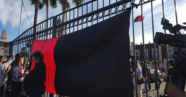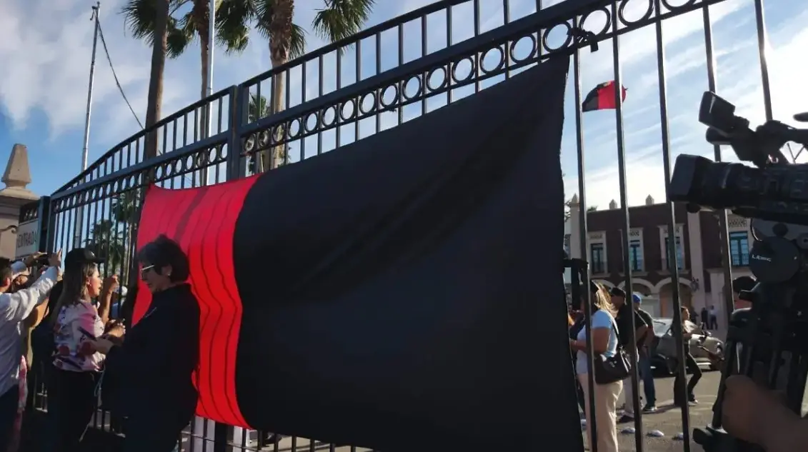 Desde la tarde, trabajadores colocaron banderas rojinegras en accesos y salidas de la institución, desafiando la resolución del juez A del Primer Tribunal Laboral del Distrito Judicial 1, quien ordenó archivar de manera total y definitiva el expediente promovido por el gremio.