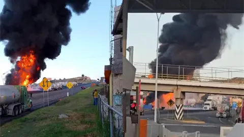 La explosión de una pipa cargada con combustible mantiene el cierre de la autopista México–Tuxpan, a la altura de la caseta de San Alejo, en el municipio de Tulancingo, Hidalgo.