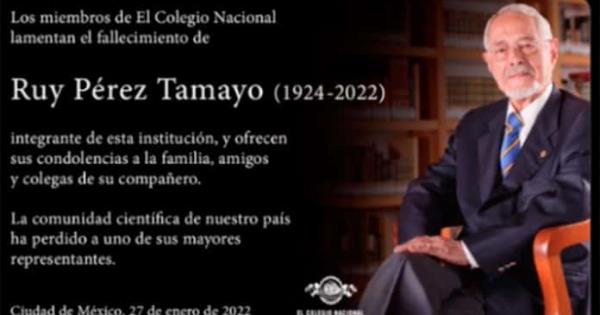 Falleció el médico patólogo e inmunólogo Ruy Pérez Tamayo (8 de noviembre de 1924, Tampico, Tamaulipas - 26 de enero de 2022, Ensenada, Baja California), a los 97 años, informaron El Colegio Nacional y la Academia Mexicana de la Lengua.