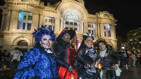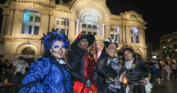 Ciudad de México.- A las 19:00 horas, frente al Palacio de Bellas Artes, un grupo de cuatro amigas se alista para comenzar la celebración del Día de Muertos. Entre risas y brochas de maquillaje, retocan los detalles finales de sus rostros pintados de catrinas.
