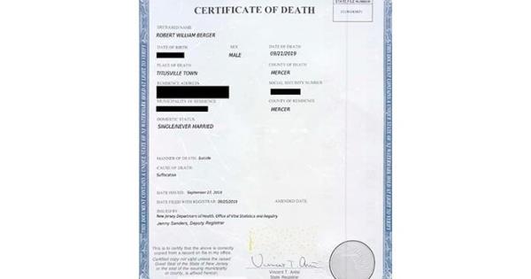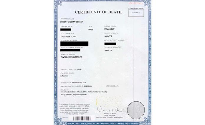 El verdadero Departamento de Salud, Estadísticas Vitales y Registro de Nueva Jersey confirmó que el acta de defunción de Berger era falso, añadieron los fiscales.