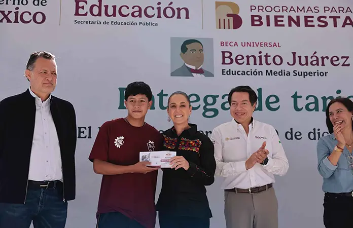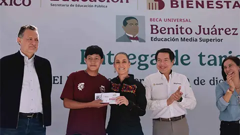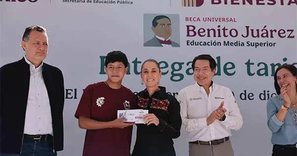 Durante la entrega de tarjetas de la beca Benito Juárez en el CBTIS 304 en construcción en El Marqués, Querétaro, Sheinbaum Pardo destacó avances en la creación de nuevos espacios educativos en todo el país.
