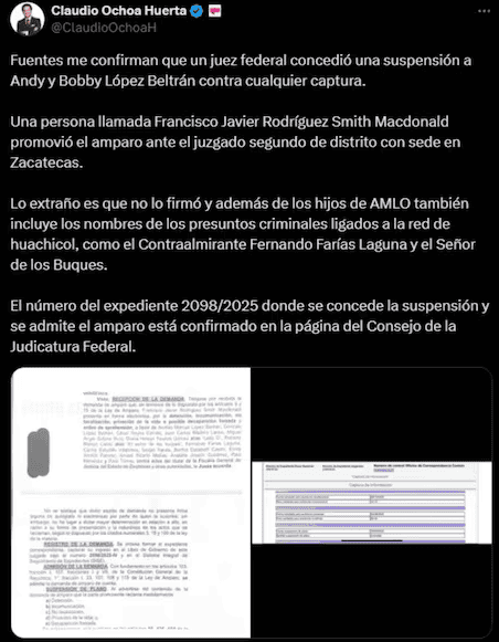 De acuerdo con Ochoa, la medida cautelar fue promovida por Francisco Havier Rodríguez Smith Macdonald ante el Juzgado Segundo de Distrito con sede en Zacatecas. El documento no lleva firma y tampoco señala un domicilio para notificaciones, sino el Hotel Círculo Mexicano, ubicado en el Centro Histórico de la Ciudad de México.