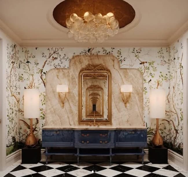 Un candil con 400 hojas de oro ilumina el baño de visitas de la Mansión Dorada de la Gobernadora de Chihuahua, María Eugenia Campos Galván. Su tapiz floral con ramas que trepan los muros y el lavabo con motivos vegetales de Art Nouveau, así como cubierta de cuarcita Taj Mahal traen al espacio íntimo la naturaleza del paisajismo en el acceso principal de la residencia, dominado por árboles nativos de vivero que fueron trasplantados con grúa por su gran peso y altura.