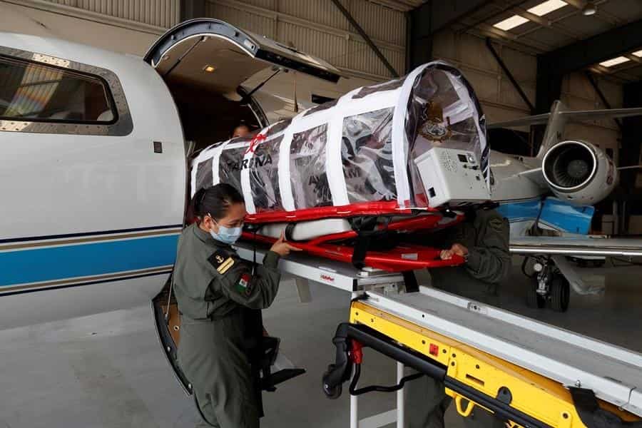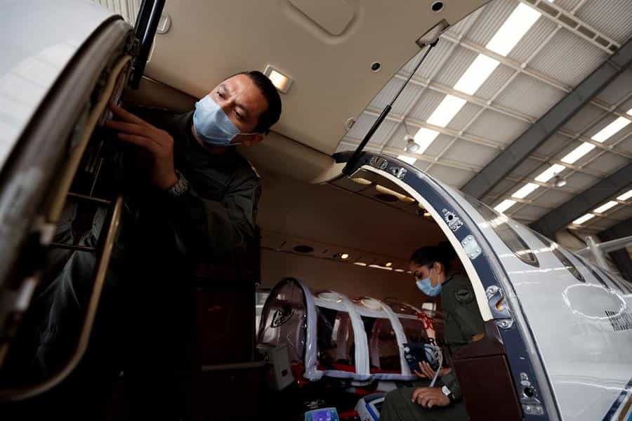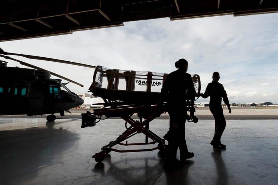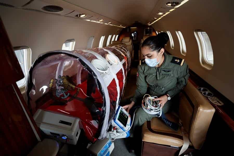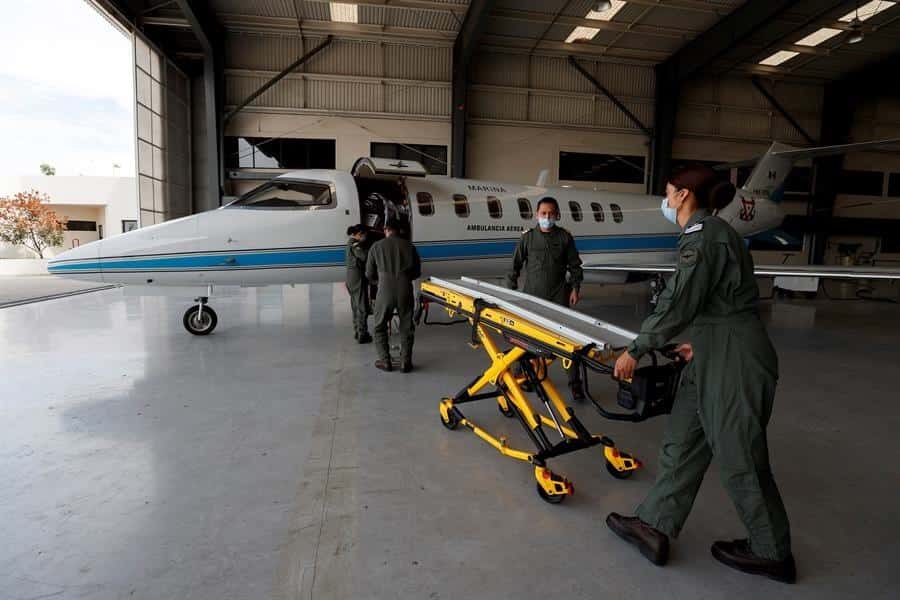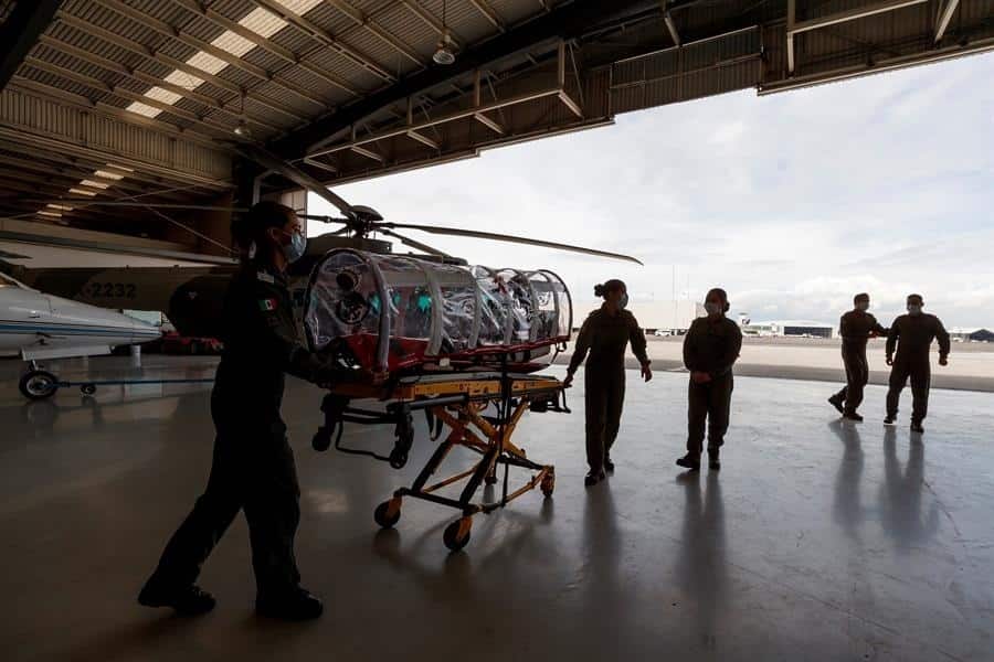CIUDAD DE MÉXICO (EFE).- Con camillas cápsula, respiradores y limpieza extrema, la tripulación de las cinco ambulancias aéreas de la Secretaría de Marina buscar salvar vidas de pacientes de COVID-19 que trasladan a centros médicos en sus misiones por todo México.
