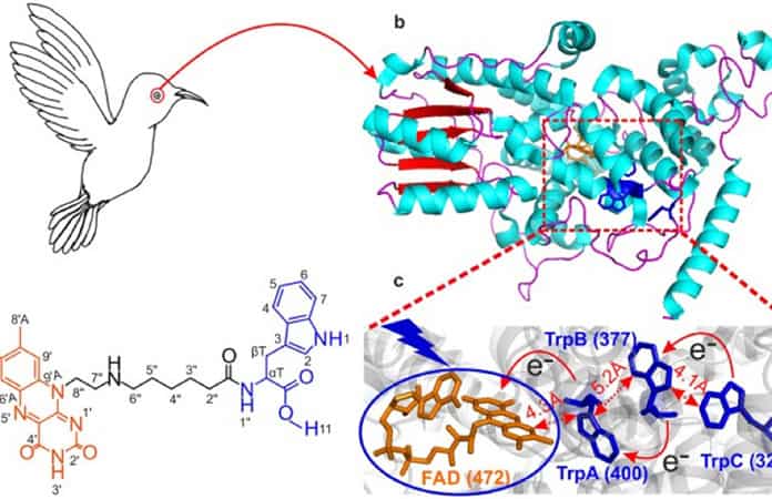? En la retina de las aves migratorias, la luz azul sobre la proteína Criptocromo desprende electrones de sus átomos, los cuales giran en sentidos que dependen del campo magnético terrestre.