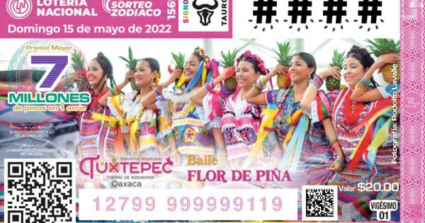 OAXACA, Oax., mayo 7 (EL UNIVERSAL).- La Lotería Nacional lanzó, en víspera de la Guelaguetza, que se celebra el mes de julio, un billete alusivo a la Flor de piña, baile representativo de San Juan Bautista Tuxtepec que se ha convertido en uno de los principales atractivos de la llamada "máxima fiesta de los oaxaqueños" y se ha conocido mundialmente como el símbolo de Tuxtepec. Se trata del billete de Lotería del Sorteo Zodiaco no. 1569, precisa al respecto la Lotería Nacional.