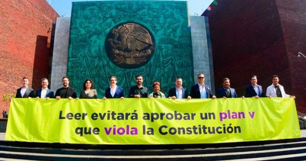 Las y los legisladores naranjas se manifestaron en el frontispicio de San Lázaro, con una manta que incluyó la leyenda "Leer evitará aprobar un plan V que viola la Constitución".