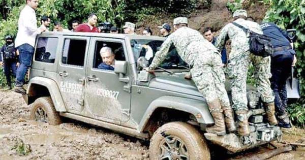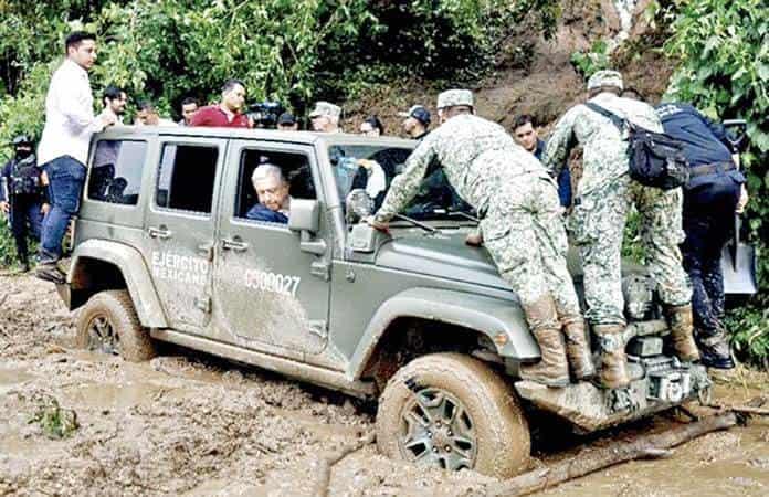 Fue en la comunidad llamada “kilómetro 39” donde debido al lodo que impedía el paso del vehículo militar el Mandatario federal tuvo que cruzar a pie.