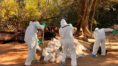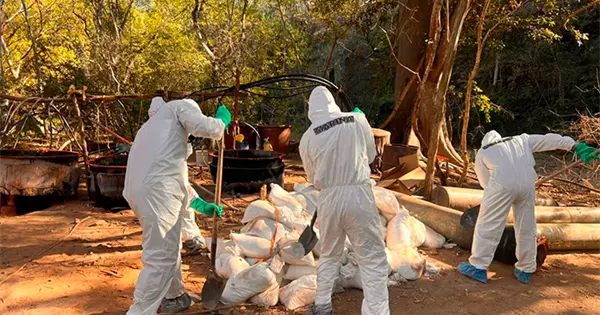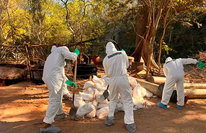 En esos puntos se encontró mil 430 litros de una sustancia química desconocida, tres mil 766 litros de acetona, mil 645 de ácido clorhídrico, mil 350 litros de alcohol, 450 litros de tolueno, 830 litros de thinner, 170 litros de ácido fosfórico, 80 de metanol, 50 de alcohol ferroso y 40 litros de ácido muriático.
