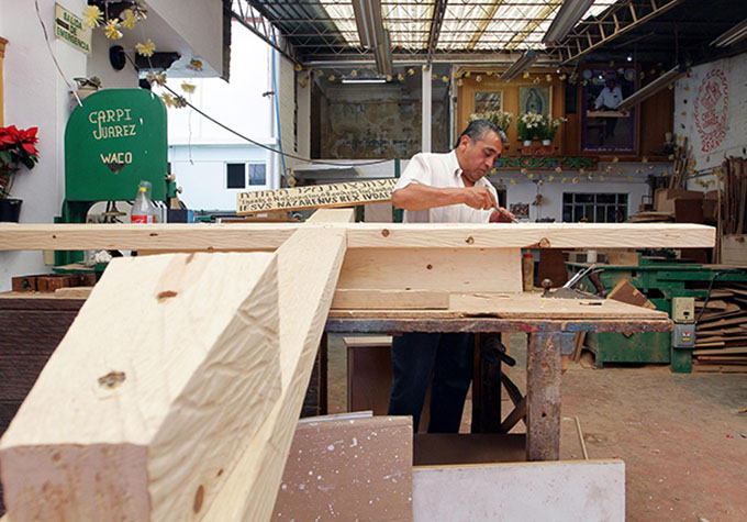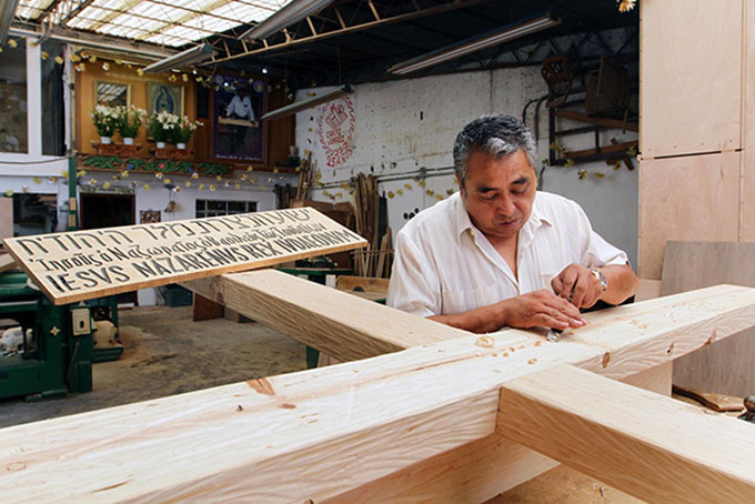 Ángel Juárez tiene 55 años de edad, 35 de los cuales los ha pasado entre las virutas de madera que desprenden las vigas que con mazos y clavos se convierten en la cruz que cargará alguno de quienes dan vida al Cristo en la representación del Viacrucis en Iztapalapa.