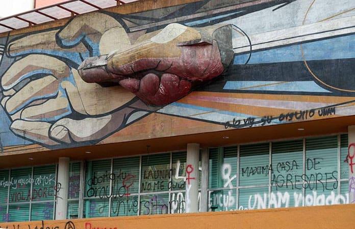 Esas obras de gran valor artístico fueron intervenidas este lunes, de nueva cuenta, durante una manifestación ante la Rectoría de la UNAM. A través de un comunicado, la Máxima Casa de Estudios señala que "las agresiones y daños ocasionados al patrimonio de la Universidad y, por tanto de la Nación, desvirtúan el fondo de la manifestación. Ejercer la violencia con tanta brutalidad, cuando se dice estar contra la violencia, es un contrasentido".
