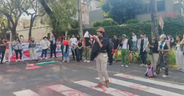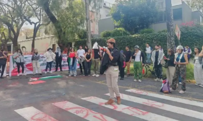 A las 11:00 horas, los protestantes se concentraron en la nueva sede diplomática ubicada en Polanco, donde exigieron el cese de la ofensiva contra Irán y paz para Medio Oriente.