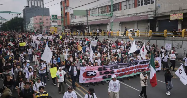 Durante el avance por Eje Central y la calle 5 de mayo, los grupos ondearon banderas de México, Palestina, de sus casas de estudios y carteles con consignas. También fichas de búsqueda de desaparecidos y los rostros de los 43 normalistas de Ayotzinapa a quienes Hernández Gamundi pidió integrar a la lucha.