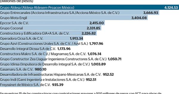 Les siguen el grupo portugués Mota-Engil, con 3 mil 404.08 mdp; las mexicanas Epccor, con 2 mil 415 mdp; Coconal, con 2 mil 331.85 mdp; Constructora y Edificadora GIA+A, con 2 mil 226.82 mdp; Operadora Cicsa, con mil 913.34 mdp; el español Grupo Azvi, con mil 797.96 mdp; Desarrollo Integral Diccsa, con mil 173.96 mdp; Constructora Makro, con mil 76.14 mdp; Grupo Constructor Zea, con mil 50.71 mdp; Grupo Idinsa, con mil 3.89 mdp; Gasamaru, con 980.103 mdp; Desarrolladora de Infraestructuras Hispano-Mexicanas, con 952.516 mdp; Grupo Indi, con 952.516 mdp, la francesa Freyssinet, con 935.39 mdp, y Propiedades Inmobiliarias de México, con 933.65 millones de pesos.