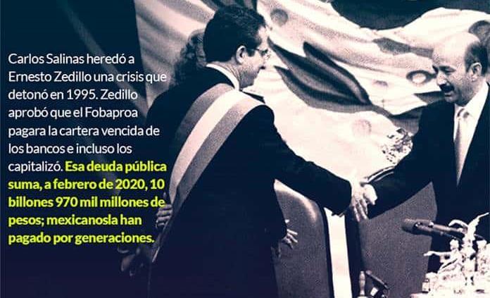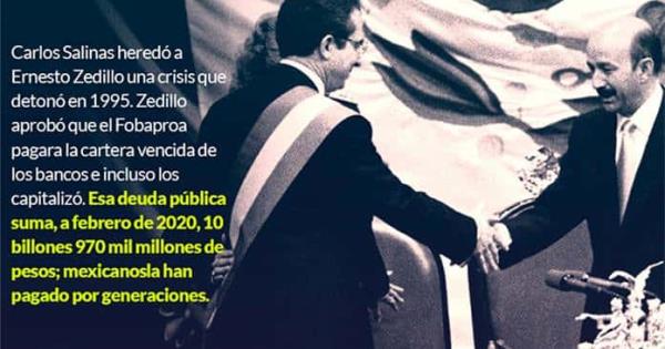 El Primer Mandatario pone de ejemplo una larga historia de rescates de parte del Estado mexicano a compañías y empresarios poderosos a lo largo de las crisis económicas del México moderno, especialmente el caso del Fondo Bancario de Protección al Ahorro (Fobaproa), creado en 1990, pero que en 1994, con el priista Ernesto Zedillo Ponce de León como Presidente, absorbió la cartera vencida de los bancos instalados en México, e incluso los capitalizó. Esa deuda ahora pública asciende hasta febrero de este 2020 a 10 billones 970 mil millones de pesos (7 billones por deuda interna y 201 mil millones de dólares por deuda externa). De ésta, ha repetido el Primer Mandatario, los mexicanos han pagado el capital por generaciones y sólo por concepto de intereses erogan medio billón de pesos cada año.