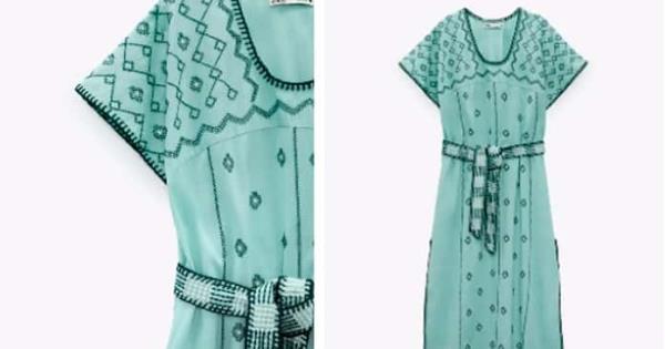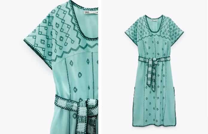 En el caso de Zara, la Secretaría de Cultura reclama la pieza "Vestido midi de escote pico y manga corta. Detalle de bordados combinados a contraste. Cinturón lazada en mismo tejido. Bajo con aberturas laterales".