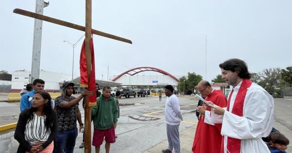 Con una cruz de madera elaborada por los mismos solicitantes de asilo, los clérigos oficiaron una misa con la asistencia de adultos y niños en la que pidieron por el cese al sufrimiento que día a día se enfrentan miles de personas de diversas nacionalidades que emprenden el viaje hacia la nación norteamericana.
